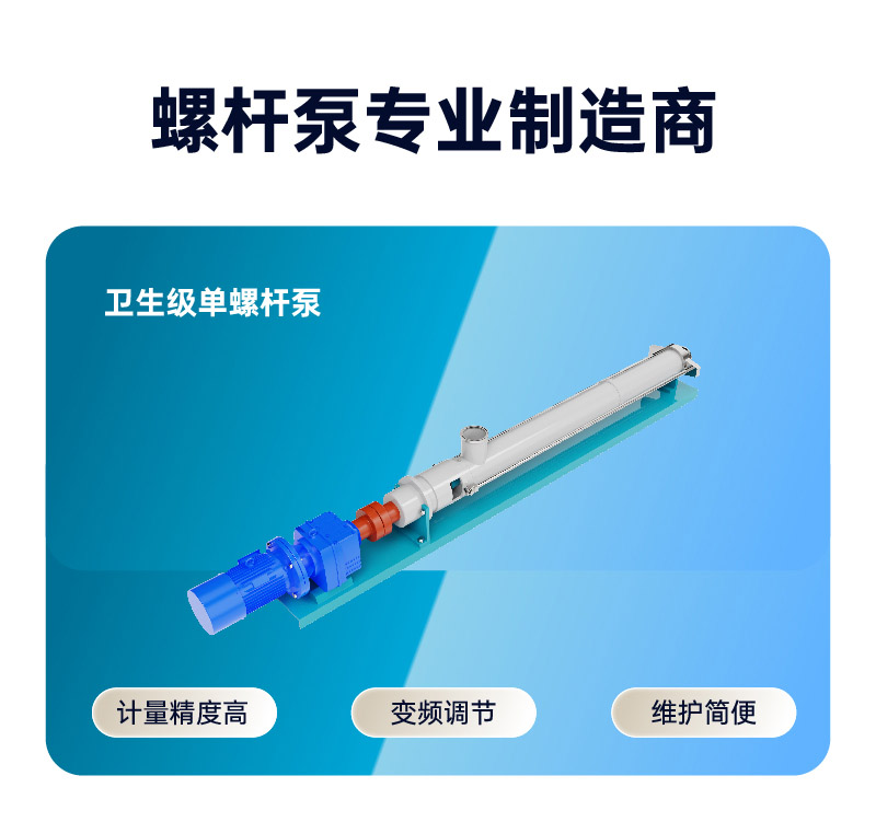 卫生级螺杆泵是一种单螺杆式输运泵,它的主要工作部件是偏心螺旋体的螺杆(称转子)和内表面呈双线螺旋面的螺杆衬套(称定子)。其工作原理是当电动机带动泵轴转动时,螺杆一方面绕本身的轴线旋转,另一方面它又沿衬套内表面滚动,于是形成泵的密封腔室。螺杆每转一周,密封腔内的液体向前推进一个螺距,随着螺杆的连续转动,液体螺旋形方式从一个密封腔压向另一个密封腔,最后挤出泵体。